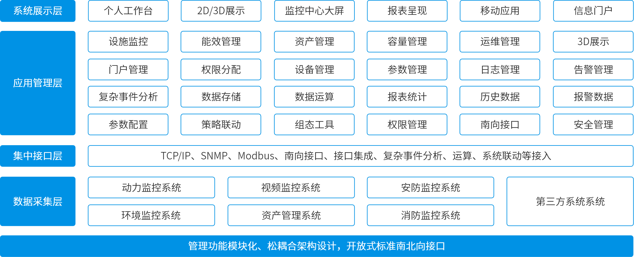 數(shù)據(jù)中心智能監(jiān)控數(shù)字化解決方案為數(shù)據(jù)中心的決策者、管理者和使用者提供高效、優(yōu)質(zhì)的服務;通過平臺軟件將數(shù)據(jù)中心及園區(qū)各個子系統(tǒng)做到統(tǒng)一管理,綜合規(guī)劃;對各個子系統(tǒng)進行有效的監(jiān)視、控制和自動化管理,實現(xiàn)集中管理,分散控制;協(xié)調(diào)各子系統(tǒng)之間的相互聯(lián)動關(guān)系,具備全局事件處理能力,完成相關(guān)的系統(tǒng)聯(lián)動控制;采集、處理、存儲各種相關(guān)數(shù)據(jù),實現(xiàn)資源共享;提供信息檢索、分析、顯示圖表,生成報表、打印報表等管理功能,為管理人員提供有力的科學決策支持。該產(chǎn)品可廣泛應用于各大中型機房或企業(yè)的IDC機房、也可應用于各運營商的通信機樓、數(shù)據(jù)機房、交換機房等,實現(xiàn)統(tǒng)一監(jiān)控、管理、運營分析,實現(xiàn)數(shù)據(jù)中心運維自動化,提升運維工作效率,節(jié)省運維成本,降低能耗,保障數(shù)據(jù)中心的可用性。