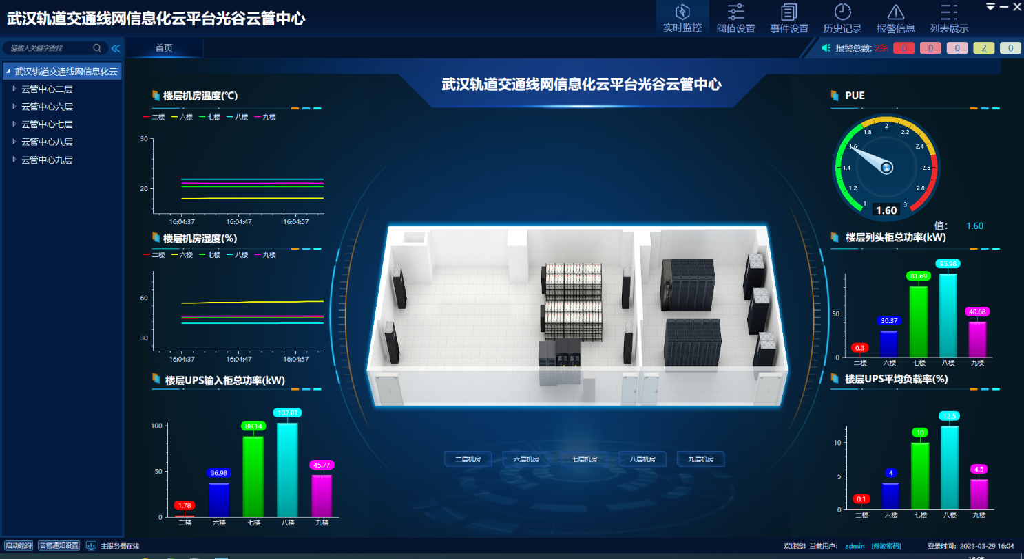 機(jī)房動(dòng)環(huán)監(jiān)測(cè)系統(tǒng)依托光谷控制中心、武湖控制中心、光谷云管中心內(nèi)的基礎(chǔ)配套設(shè)備,監(jiān)測(cè)配電柜、UPS等設(shè)備的工作狀態(tài)、精密空調(diào)漏水檢測(cè)裝置、數(shù)據(jù)機(jī)房及電源室的溫濕度監(jiān)測(cè)以及視頻監(jiān)控,形成統(tǒng)一的集中監(jiān)測(cè)系統(tǒng)。通過模擬出云平臺(tái)項(xiàng)目各機(jī)房的實(shí)景3D圖像,將各個(gè)子系統(tǒng)實(shí)時(shí)運(yùn)行狀態(tài)集成在機(jī)房操控室電腦客戶端,實(shí)現(xiàn)運(yùn)維人員本地監(jiān)測(cè)和異地報(bào)警同步的功能。