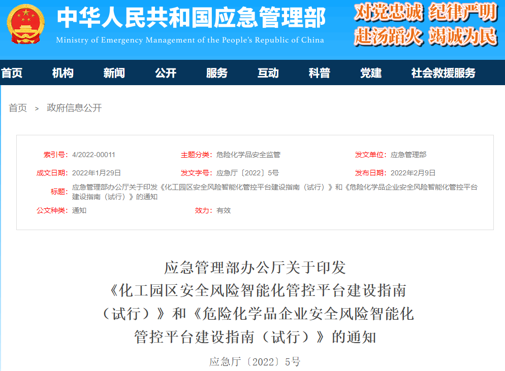 應(yīng)急管理部印發(fā)《化工園區(qū)安全風(fēng)險(xiǎn)智能化管控平臺(tái)建設(shè)指南(試行)》和《危險(xiǎn)化學(xué)品企業(yè)安全風(fēng)險(xiǎn)智能化管控平臺(tái)建設(shè)指南(試行)》,以指導(dǎo)化工園區(qū)和危險(xiǎn)化學(xué)品企業(yè)建平臺(tái)、用平臺(tái),運(yùn)用信息數(shù)字等先進(jìn)技術(shù)手段強(qiáng)化安全風(fēng)險(xiǎn)防控能力,推動(dòng)化工園區(qū)、危險(xiǎn)化學(xué)品安全風(fēng)險(xiǎn)管控?cái)?shù)字化轉(zhuǎn)型、智能化升級(jí)。