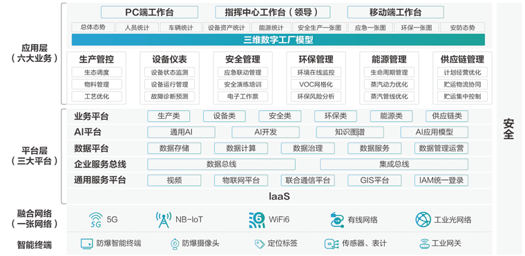 以中國石化的園區(qū)為例:中石化作為“世界一流綠色低碳城市型煉化示范企業(yè)建設試點”的重點企業(yè),中國石化基于5G如翼定制網模式打造智能石化工廠,將新一代信息技術與石化工業(yè)生產過程深度融合,提高了勞動生產率的同時也提升了本質安全環(huán)保水平。具體表現在,通過搭建一體化應急指揮中心,實現生產運營業(yè)務協同、高效指揮,園區(qū)集約化、一體化生產管控能力顯著提升。通過利用物聯網、三維模型和地理信息技術等,對全廠污染排放點和職業(yè)危害監(jiān)測點進行實時動態(tài)監(jiān)控和預警,實現“三廢”達標排放,園區(qū)預測預警能力、本質安全環(huán)保水平顯著提高。