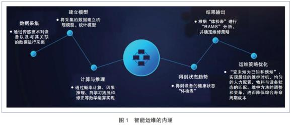 智能運維是通過對設(shè)備狀態(tài)數(shù)據(jù)進(jìn)行采集、存儲、加工,分析和判斷數(shù)據(jù)信息與設(shè)備的健康狀態(tài)是否吻合,并輸出判斷的結(jié)果,進(jìn)而實現(xiàn)對維修策略的指導(dǎo)(圖 1)。其通過物聯(lián)網(wǎng)和不同功能的算法模塊實現(xiàn),而實現(xiàn)關(guān)鍵在于以下 2 點:①搭建強(qiáng)大且可靠的數(shù)據(jù)采集及終端回饋系統(tǒng),包括傳感器、網(wǎng)絡(luò)通信及數(shù)據(jù)庫;②開發(fā)科學(xué)合理的分析算法,包括依據(jù)目標(biāo)要求設(shè)計的數(shù)學(xué)模型和決策模型。