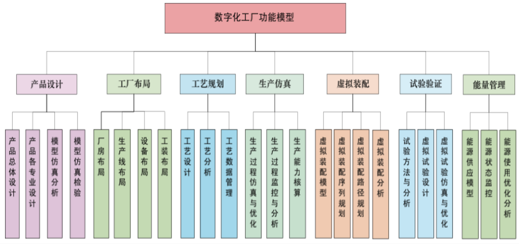 1)建模技術:數字化工廠最大的特點就是產品設計和生產均可在數字化空間中虛擬進行,這樣不僅可以對產品設計可行性進行仿真驗證,還可以對新產品進行可制造性和制造成本提前預估分析。要實現上述功能首先要建立基于模型定義技術(MBD技術)的各種要素的數字化模型,本文在蔡敏等提出的6類模型基礎上將數字化工廠各種要素模型按功能分為產品設計、工廠布局、工藝規(guī)劃、生產仿真、虛擬裝配、試驗驗證和能量管理等7個部分,如圖2所示。
