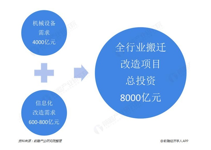 據工信部對有關省區(qū)的摸底調研情況,按照規(guī)范發(fā)展的要求,初步估計全行業(yè)搬遷改造項目總投資超過8000億元,可帶動約4000億元的機械設備需求和600-800億元的信息化改造需求。