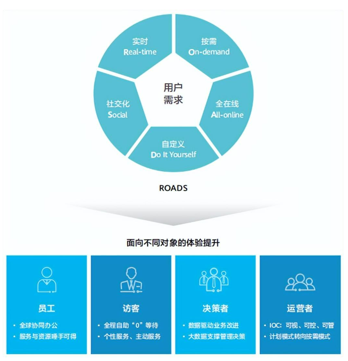 面向園區(qū)不同對象,提供ROADS化體驗,幫助員工提升工作效率,帶給訪客賓至如歸的體驗,使能運營從計劃模式向按需模式轉變,支撐基于大數(shù)據(jù)的管理決策。
