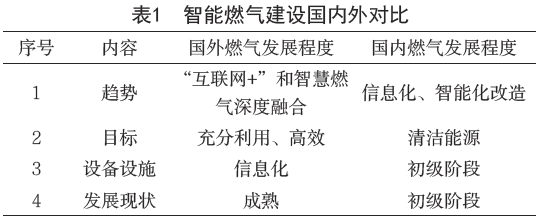 如下表1中所示,國內(nèi)城鎮(zhèn)燃?xì)馄髽I(yè)在智能化建設(shè)方面尚處于發(fā)展階段,而國外發(fā)達(dá)國家已進(jìn)入成熟階段,在發(fā)展趨勢(shì)方面國外已進(jìn)行互聯(lián)網(wǎng)和燃?xì)馍疃热诤?,而國?nèi)處于改造階段,在智能設(shè)備方面已體現(xiàn)信息化,國內(nèi)尚處于起步階段。