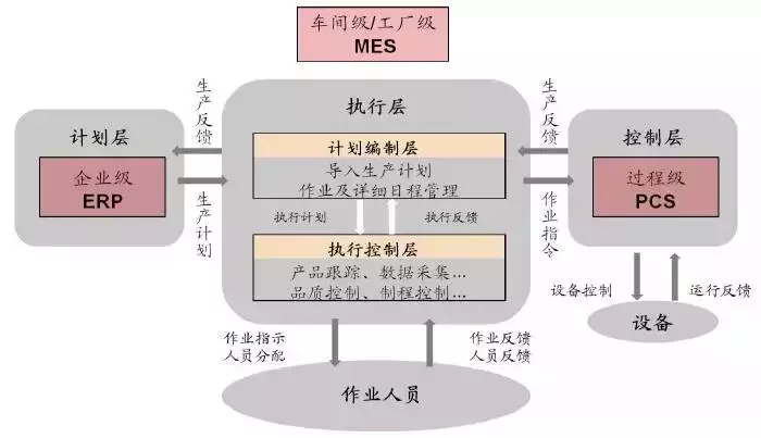 智慧工廠擁有三個(gè)層次的基本架構(gòu),分別為頂層的計(jì)劃層、中間層的執(zhí)行層以及底層的設(shè)備控制層,大致可對應(yīng)為ERP系統(tǒng)(企業(yè)資源計(jì)劃)、MES系統(tǒng)(制造執(zhí)行系統(tǒng))以及PCS系統(tǒng)(過程控制系統(tǒng))。