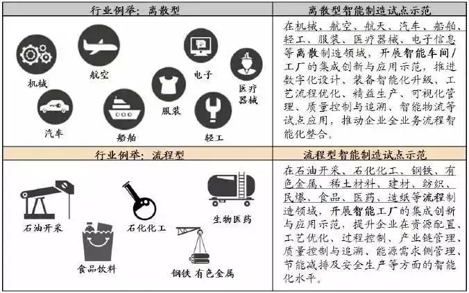 按MES系統(tǒng)的分類,智慧工廠的下游行業(yè)可粗略地劃分為離散型與流程型。其中,離散型行業(yè)主要包括機(jī)械、航空航天、汽車等,流程性行業(yè)主要包括石油化工、生物醫(yī)藥、食品飲料、紡織等。
