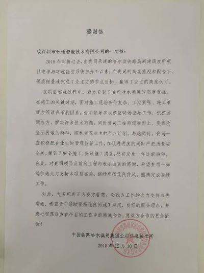 我們很榮幸參與本次項目建設(shè),鐵路信息化建設(shè)添磚加瓦 與哈牡鐵路建設(shè)者一起共度難關(guān),為哈牡鐵路的開通獻(xiàn)出一份力量。感謝用戶給予我們極大的肯定與認(rèn)可,同時我們會始終會以用戶為中心,秉承“誠信為本”的理念為用戶提供智能安全的機(jī)房監(jiān)控解決方案。