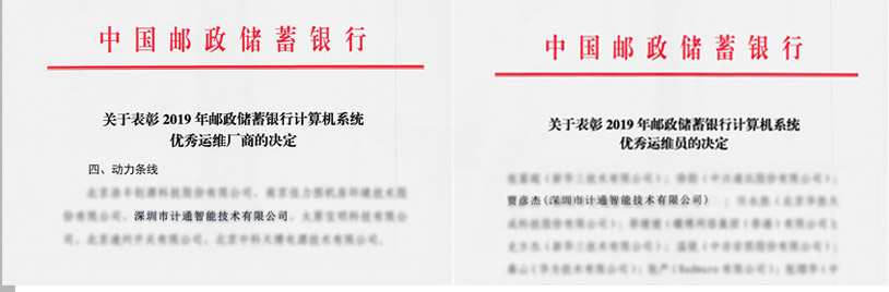深圳計通的數(shù)據(jù)中心基礎設施解決方案在郵儲銀行各方面出色的表現(xiàn),贏得了郵儲銀行連年贊譽和肯定。深圳計通在歷年獲得郵儲優(yōu)秀維護榮譽之后,2019年度再次榮獲“2019年郵政儲蓄銀行計算機系統(tǒng)優(yōu)秀運維廠商”及 “2019年郵政儲蓄銀行計算機系統(tǒng)優(yōu)秀運維員”榮譽稱號。這些獎項的獲得就是郵儲銀行對深圳計通的高度認可。