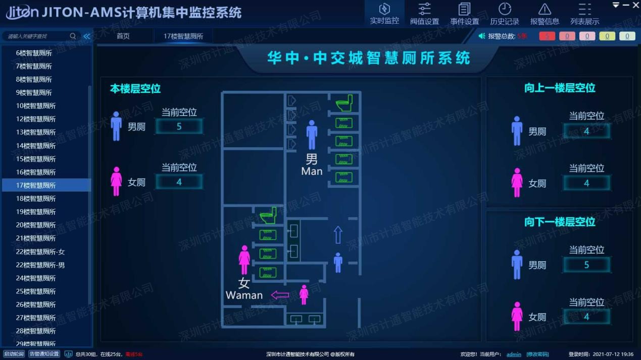 此外,為了給園區(qū)員工提供一個(gè)良好的環(huán)境,解決廁所異味控制,廁位引導(dǎo)的問(wèn)題,讓廁所時(shí)刻處于清潔、舒適、衛(wèi)生的狀態(tài),深圳計(jì)通針對(duì)目前存在的痛點(diǎn),向中國(guó)交建提供了智慧廁所監(jiān)控系統(tǒng)解決方案。
