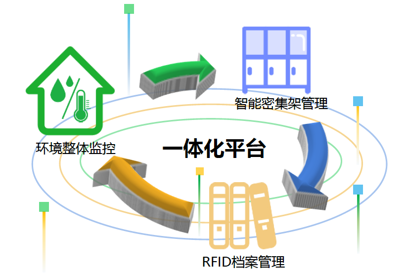 檔案庫房智能環(huán)境管理通過采集庫房環(huán)境溫濕度、空氣質(zhì)量等數(shù)據(jù),結(jié)合空調(diào)、加濕/除濕機、消毒凈化機、新風(fēng)機等設(shè)備,對庫房內(nèi)恒溫恒濕與空氣凈化進(jìn)行管理和控制,實現(xiàn)環(huán)境參數(shù)變化與設(shè)備間的智能聯(lián)動控制。同時集成安全防范(如門禁、視頻、紅外入侵、消防等)、智能燈控等子系統(tǒng),全方位保障檔案庫房和實體檔案的安全。